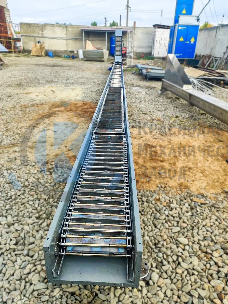 • Тяговый орган: роликовая или втулочно-роликовая цепь промышленного исполнения, рассчитанная на работу в абразивной среде.